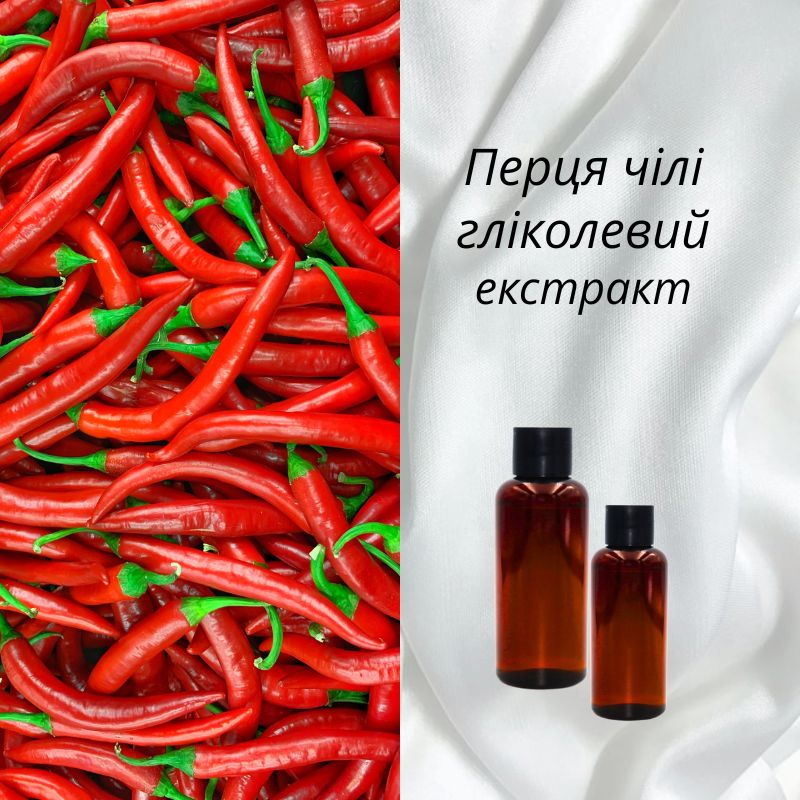 Гликолевый экстракт перца чили не содержит в себе балластных примесей и богат накапсаицин (7%), каротиноиды, терпены и терпеноиды (алилфуран, цимен, декан, терпенилацетат, ундекан, пенокамфен, карвон, селин, кариофилен), жирные кислоты. Подобный состав осуществляет бактерицидное и разогревающее действие, улучшает кровообращения в коже.