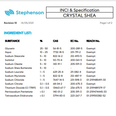 Crystal Shea – это основа для мыла серии "Растопи и Залей" ("MELT&POUR"). Изготовлена из натурального растительного сырья без добавления поверхностно-активных веществ и монопропиленгликоля (MPG). В качестве источника жирных кислот и масел (18%) используется масло Ши.