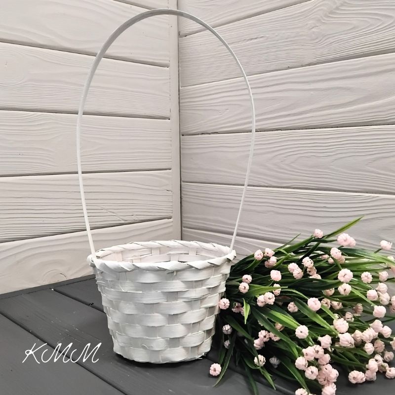 Корзина изготовлена из лозы, окрашена в белый цвет, при этом фактура лозы сохранена.