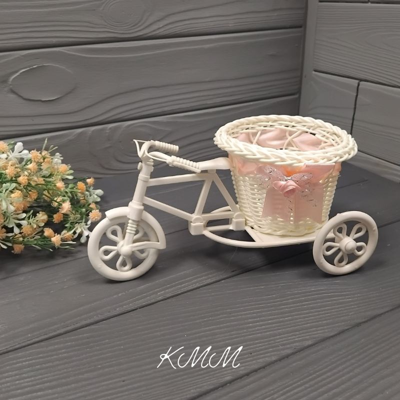 Используется, как кашпо для цветов, сделан из белого пластика с атласной лентой. Оригинальный вариант для декора цветочных композиций, мыльных букетов, подарков, изделий из глины, воска. Велосипед с плетенной корзиной декоративный очень практичный в применении декор, влагостойкий, легко моется, неприхотлив в хранении. Настройки экрана вашего устройства могут искажать цвет изделия.